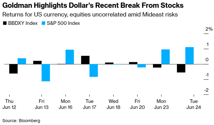 高盛集团表示,本月以中东为中心的地缘政治紧张局势正在重建美元与风险资产之间传统的反向关系。