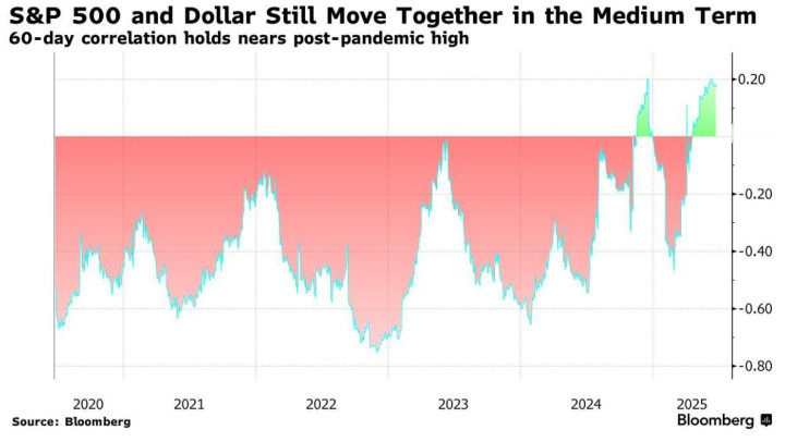 不过,在更长的时间范围内,大约两个月的时间里,美元仍与美国股市呈正相关。这意味着,随着全球风险情绪改善,美元往往会走强,反之亦然——这与美元作为全球投资者避险货币的传统角色发生了巨大转变。